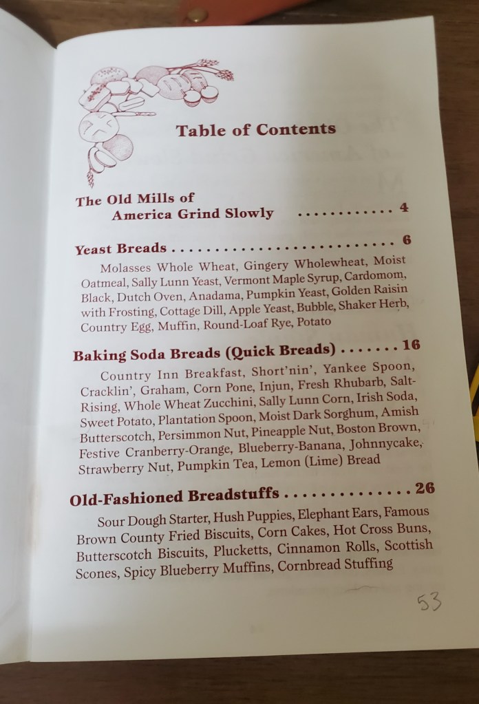 There’s a couple pages on the history of mills, and lots of old-fashioned recipes. I want to try all 53. Actually 52. One is for a sourdough starter but there’s no sourdough recipe, which I found odd. And I have another starter recipe I like a lot so I may skip it. We’ll see. The sweet potato bread sounds gross to me. Full disclosure: I hate sweet potatoes. I like most foods but I do have some hard aversions. Mushrooms, sweet potatoes, and olives. Avocado I don’t like either but I’ll just pick it out. Same with shrimp. Other than that I’m pretty open to most foods. That being said, I’ll still make the sweet potato and maybe see if a family member wants it.