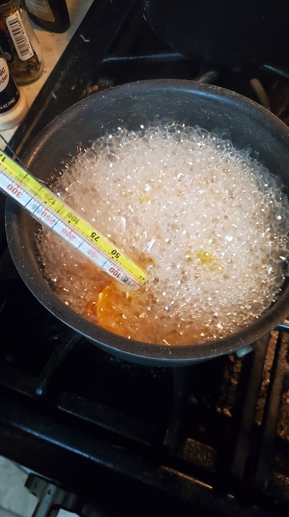 I made a simple syrup, heated it, and added the first batch of slices. My brand new candy thermometer came in handy. The recipe said to heat the sugar up to 250 degrees F so that’s what I did.