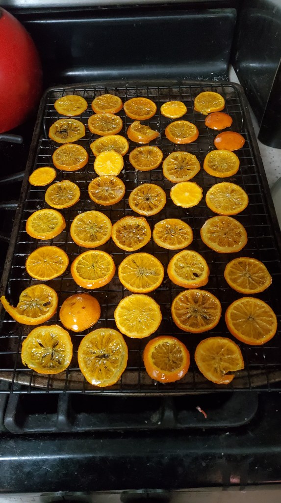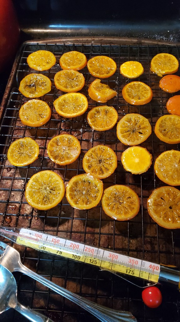 The slices are still drying out some, and it may take until tomorrow. I’ll buy some chocolate and dip the more bitter ones and have a party. If I make it again I MAY slice them slightly thinner. Or maybe I’ll try LIMES. I love limes so much. One of the bread recipes in my book is for lime bread and I’m so excited.